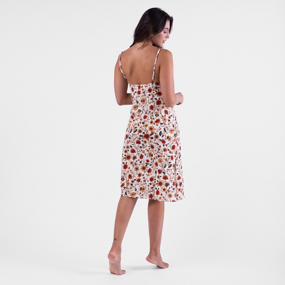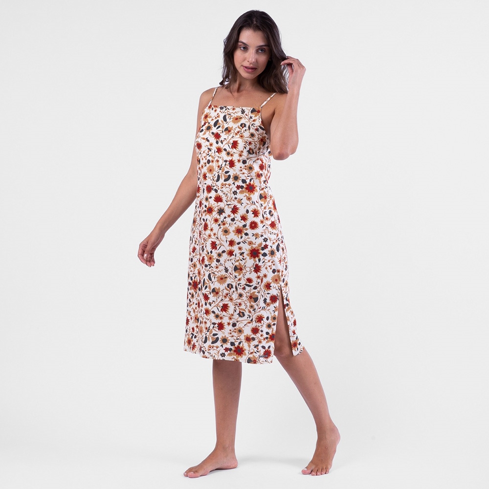 Vestido longo com estampa corrida exclusiva da coleção;